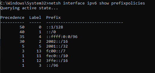 netsh interface ipv6 set prefixpolicy ::ffff:0:0/96 35 4